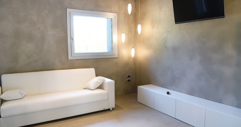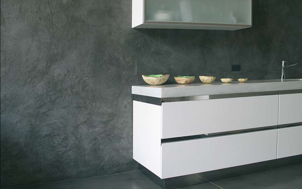 Стены, отделанные микроцементом, выглядят современно и универсально. Материал отлично подходит для кухонь, ванных комнат и жилых помещений, где важна влагостойкость.